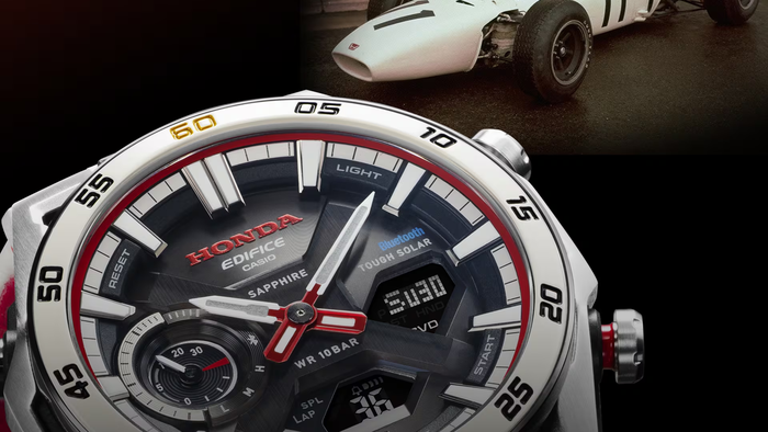 O relógio inspirado em carro de F1 da Honda combina aço inoxidável com resina reforçada com carbono, conta com vidro de safira e resistência à água de até 100 metros. Também oferece carregamento solar, conexão com celular via Bluetooth, ajuste automático de hora, horário mundial, alarmes e localizador de smartphone.