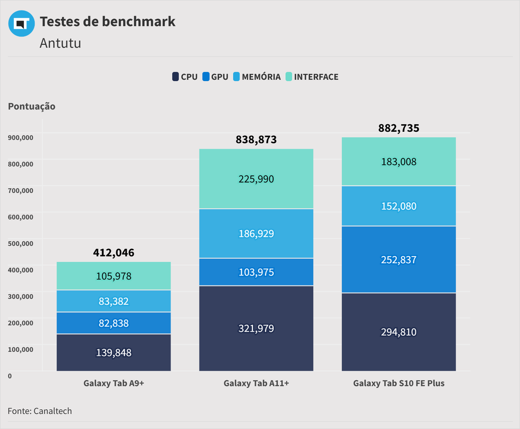 Nos testes de benchmark, o aparelho marcou 838.873 pontos gerais. O resultado comprova que ele tem força suficiente para o básico, mas exige paciência em tarefas muito pesadas.